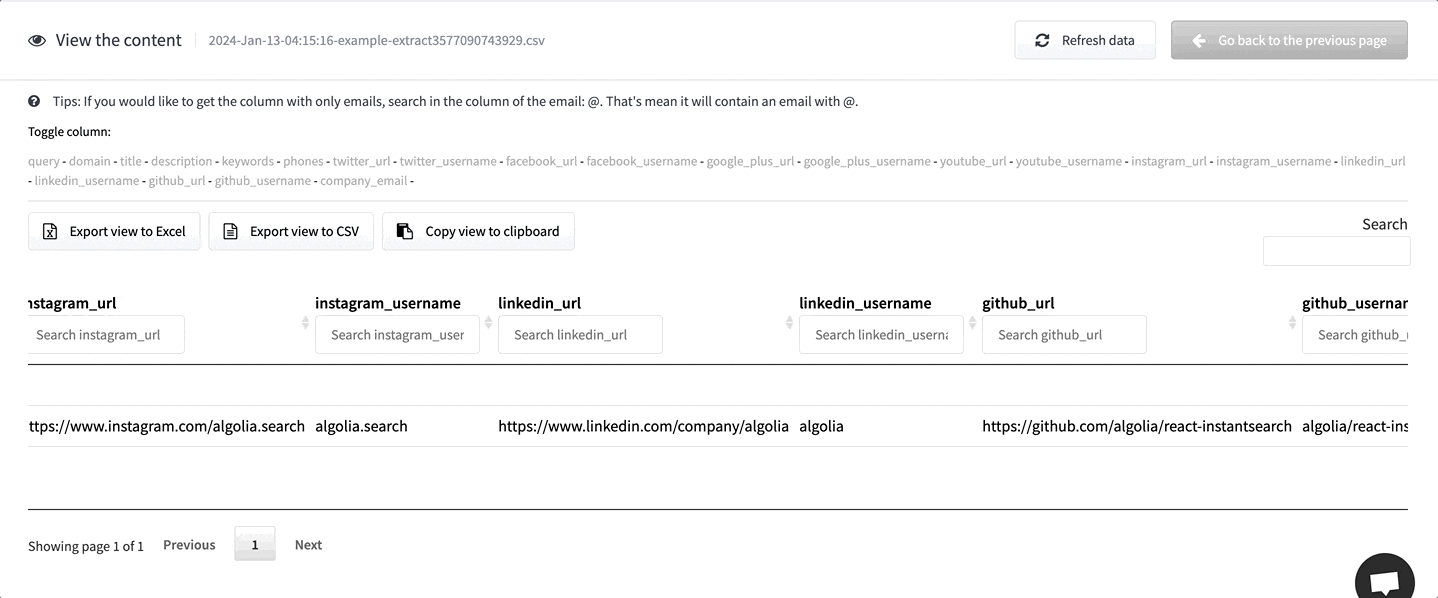 Vous pouvez importer une liste de domaines et extraire les adresses e-mail, les URL de réseaux sociaux, les noms d'utilisateur (Facebook, Twitter, etc.) et les numéros de téléphone de toutes les pages de chaque site web. Un rapport Excel est téléchargeable une fois toutes les adresses e-mail extraites. C'est la solution idéale pour extraire toutes les adresses e-mail d'une liste de sites web (entreprises).